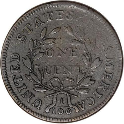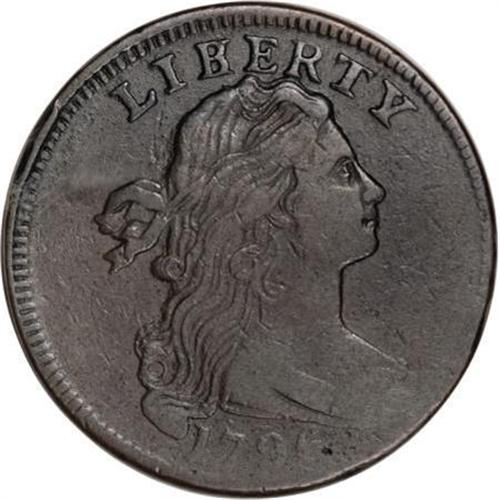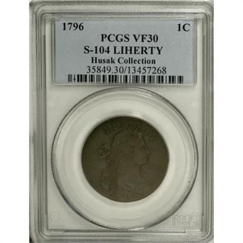 <B>1796 1C LIHERTY. VF30 PCGS. S-104, B-45, R.3. </B></I> <B>Noyes VG10; CC-15. Photo #26850. Our EAC Grade Fine 12.<BR><BR>Equivalents.</B></I> Proskey 15; Doughty 85; Gilbert 10; McGirk 9A; Ross 9G; Clapp-Newcomb 9; EAC 45; <I>Encyclopedia</B></I> 1698; PCGS #1413.<BR><B><BR>Variety. </B></I>LIHERTY. Reverse of 1797. Final A joins right ribbon. The obverse appears on S-103 and S-104. The reverse appears on S-104 and 105.<BR><B><BR>Surfaces. </B></I>Lovely olive-brown surfaces with a narrow rim bruise at 10 o'clock on the obverse. Unevenly struck with the lower right obverse and upper right reverse weakly defined, the drapery and OF showing little detail.<BR><BR><B>Die State III.</B></I> The reverse is cracked from the border to the top of the second T in STATES, and faintly to the left top of M.<BR><BR><B>Appearances. </B></I>The obverse and reverse are illustrated in Noyes (2007).<BR><BR><B>Census.</B></I> Although the S-104 ranks among the most common 1796 Draped Bust varieties, it is unknown better than XF, according to Bland, or VF according to Noyes. Bland grades the two finest pieces XF45, and Noyes grades his best two as just VF35. Two of the top six examples are in the ANS Collection, and another is in the Carnegie Institute. Sheldon graded the finest piece AU50 in both editions of his reference.<BR><BR><B>Commentary.</B></I> The status of S-104 as the "common" LIHERTY means it is the variety that most collectors choose when seeking a single piece to represent the blundered die. At one time, the S-103 combination was considered a much higher rarity, but more of those have been found in recent years.<BR><BR><B>Provenance.</B></I> <I>Jules Reiver (Heritage, 1/2006), lot 19287.</B></I><BR><BR><B>Personality.</B></I> A silversmith by trade, <B>Joseph Richardson</B></I> was appointed assayer of the Mint on December 12, 1795, after the death of Albion Cox. He was a distinguished member of an old Quaker family in Philadelphia who was noted for his ability, character, credit, and honor. He held the office for 35 years until his death in March 1831, and was succeeded by his son, John, who developed a dislike for the post and held the position for only about one year.<BR><BR><b>Shipping:</b> Coins & Currency (<a target="_blank" href="http://www.heritageauctions.com/common/shipping.php">view shipping information</a>)