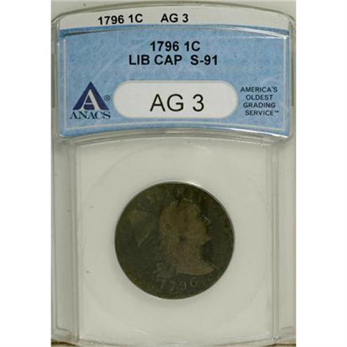 <B>1796 1C Liberty Cap AG3 ANACS.</B></I> S-91. NGC Census: (3/72). PCGS Population (2/108). Mintage: 109,825. (#1392)<BR><BR><B>Coin Engraver:</B> Joseph Wright<BR><BR><b>Shipping:</b> Coins & Currency (<a target="_blank" href="http://www.heritageauctions.com/common/shipping.php">view shipping information</a>\)