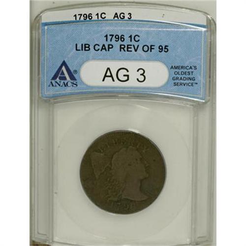 <B>1796 1C Liberty Cap AG3 ANACS.</B></I> NGC Census: (3/72). PCGS Population (2/108). Mintage: 109,825. (#1392)<BR><BR><B>Coin Engraver:</B> Joseph Wright<BR><BR><b>Shipping:</b> Coins & Currency (<a target="_blank" href="http://www.heritageauctions.com/common/shipping.php">view shipping information</a>)