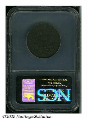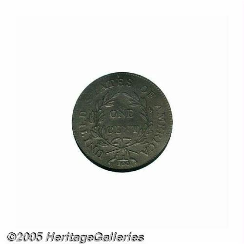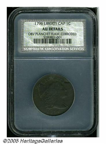 <B>1796<1C> Liberty Cap AU Details, Obverse Planchet Flaw, Corroded, NCS.</B></I> S-91, R.3. A relatively deep planchet flaw at 1:30 causes the expected softness of definition opposite at 4:30 on the reverse. A late die state that has the obverse die sunken near 7:30, which weakens the ST in STATES. Otherwise, a sharp example that has medium brown color and uniformly microgranular surfaces. Some subdued marks are on the cheek and on the left border of the neck.