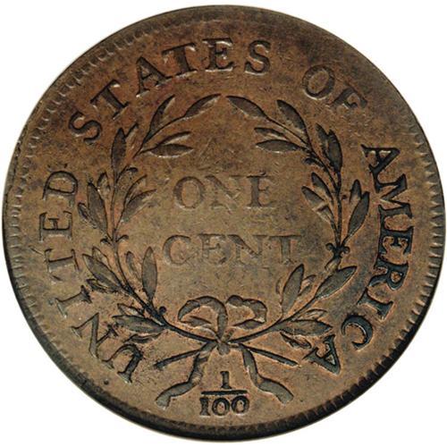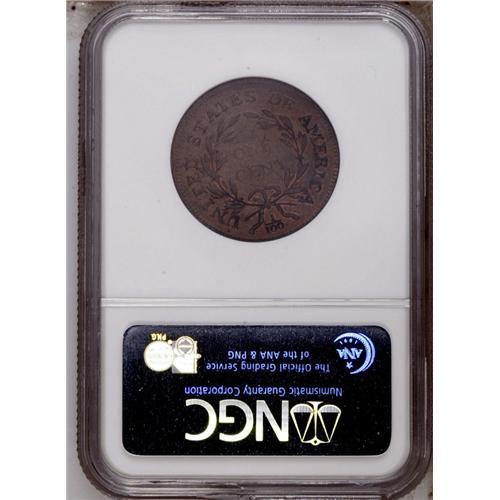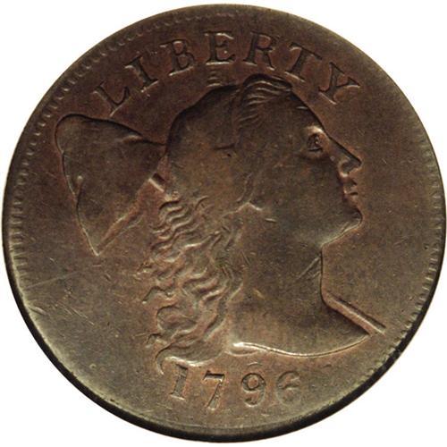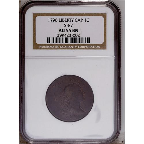 <B>1796<1C> Liberty Cap AU55 NGC.</B></I> S-87, Low R.3. Most easily attributed by the double leaf to the left of ONE, as all other 1796 reverses have a triple leaf. Medium brown patina covers most of each side with lighter reddish accents visible in the protected areas of each side. Well struck on the reverse with slightly lesser definition on the obverse. A pleasing, high grade example that can most easily be traced for pedigree purposes by a couple of indentions on Liberty's neck and a few degrees of counterclockwise die rotation. EAC 25.