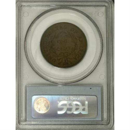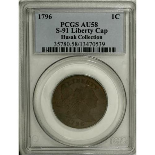 <B>1796 1C Liberty Cap. AU58 PCGS. S-91, B-1, R.3.</B></I> <B>Bland AU50; Tied for CC-5. Noyes AU50; CC-4. Photo #22465. Our EAC Grade AU50.<BR><BR>Equivalents.</B></I> Proskey 7; Doughty 80; Gilbert F; McGirk 2D; Ross 4C; Clapp-Newcomb F; EAC 1; <I>Encyclopedia</B></I> 1682; PCGS #1392.<BR><B><BR>Variety. </B></I>Curved date, widely spaced; RT nearly touch forelock. Double leaves at UN and CA. The obverse appears on S-91. The reverse appears on S-91. Plain Edge.<BR><B><BR>Surfaces. </B></I>Absolutely superb surfaces and color for the grade. Both sides have mostly light olive, blended with darker olive and steel-brown. A few tiny abrasions are visible at the left obverse, and on the reverse, almost entirely original planchet marks.<BR><B><BR>Die State IV.</B></I> Minor die bulges are visible on both sides with horizontal scaling in the obverse fields.<BR><B><BR>Appearances.</B></I> The obverse and reverse are illustrated in <I>Early American Cents</B></I> and in Noyes (2007).<BR><B><BR>Census.</B></I> Two Mint State examples and two AU55 coins are known, per the Bland Census, with one of the AU55 pieces in the ANS. This example from the John Whitney Collection is tied with one other for fifth position.<BR><B><BR>Commentary.</B></I> Specialists debate the proper position of this variety in the emission sequence, either at the beginning or the end. It is a variety coined from a stand-alone die pairing, with neither die used for any other 1796 Liberty Cap cent. Sheldon placed it at the end of the sequence, while Loring and Breen place it at the beginning. It is not impossible that it could be from the middle of the long sequence, interrupting all other die combinations, though that would seem illogical.<BR><B><BR>Provenance.</B></I> <I>Col. E.H.R. Green; B.G. Johnson (St. Louis Stamp & Coin Co., 8/1942); James G. Macallister; J.C. Morgenthau (1/1944), lot 420, $155; George H. Clapp; ANS; Dr. William H. Sheldon; Dorothy Paschal; Robinson S. Brown, Jr. (Superior, 9/1986), lot 119, $5,775; Dr. Allen Bennett (4/1992); Eric Streiner; John Whitney (Stack's, 5/1999), lot 1721, $12,075.</B></I><BR><BR><B>Personality.</B></I> The founder and president of ALCOA, the Aluminum Company of America, <B>George Hubbard Clapp</B></I> was born in Allegheny, Pennsylvania in 1858. A graduate of the University of Pittsburgh, he was president of the school's Board of Trustees and its oldest living alumnus at the time of his death on March 31, 1949. Clapp was also on the board of trustees of the Carnegie Institute, to which he donated his collection of sea shells. He began collecting coins at a young age and was the founder of the Western Pennsylvania Numismatic Society. Clapp formed one of the finest large cent collection ever assembled, and donated his entire first-line collection to the American Numismatic Society in the late 1940s. Clapp was the author of <I>The United States Cents of the Years 1798-1799, The United States Cents 1804-1814,</B></I> and co-author of <I>The Cents of the Years 1795-1796-1797-1800</B></I> with Howard Newcomb.<BR><BR><b>Shipping:</b> Coins & Currency (<a target="_blank" href="http://www.heritageauctions.com/common/shipping.php">view shipping information</a>)