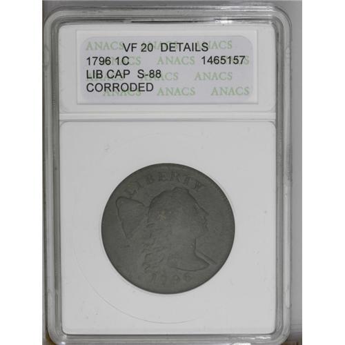 <B>1796 1C  Liberty Cap--Corroded--ANACS. VF20 Details.</B></I> S-88, R.4. This dark and somewhat rough piece has clear legends and strong details on the neck curls. EAC 8.