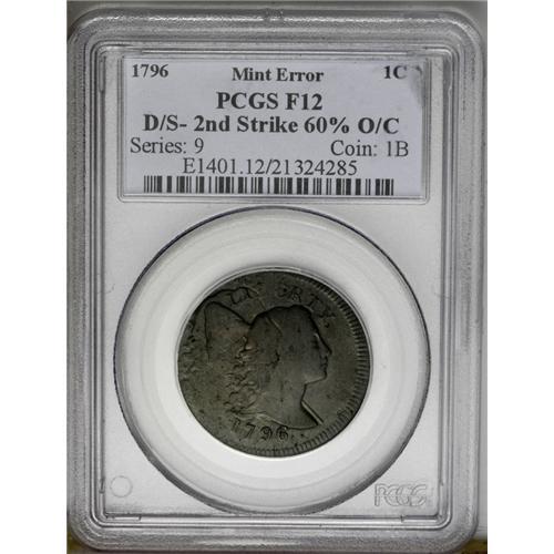 <B>1796<1C> Liberty Cap--Double Struck, Second Strike 60% Off Center--Fine 12 PCGS.</B></I> S-89, R.3. In our opinion, the second strike is only about 30% off-center, at 9:30, but this is still a remarkable and highly desirable large cent error. Nearly all of the design from the second strike is still visible, including the entire profile of Liberty and all of the date. Pleasing medium brown surfaces with hints of olive and traces of reddish patina. The surfaces have slight porosity, but no defects of any significance. EAC 8.