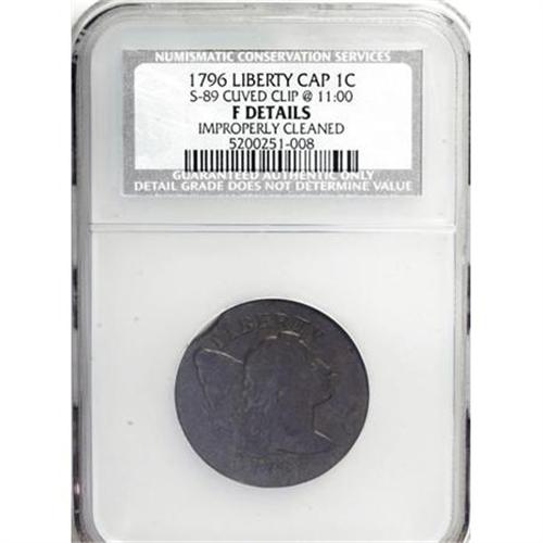 <B>1796 1C Liberty Cap--Curved Clip ¢ 11:00, Improperly Cleaned--NCS. Fine Details.</B></I> S-89. NGC Census: (6/54). PCGS Population (8/74). Mintage: 109,825. Numismedia Wsl. Price for NGC/PCGS coin in F12: $600. (#1392)<BR><BR><B>Coin Engraver:</B> Joseph Wright<BR><BR><b>Shipping:</b> Coins & Currency (<a target="_blank" href="http://www.heritageauctions.com/common/shipping.php">view shipping information</a>)