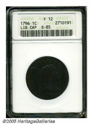 <B>1796<1C> Liberty Cap Fine 12 ANACS.</B></I> S-85, High R.5. A lavender-gray pieces with dashes of dark apricot color on selected areas of the obverse. The obverse rim has a few minor dings, and the upper reverse has softer details, but this rare variety Cent is for the most part attractive.