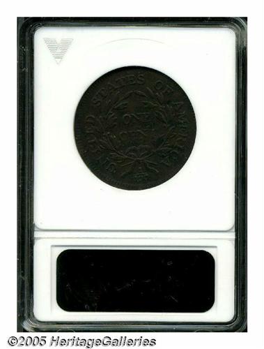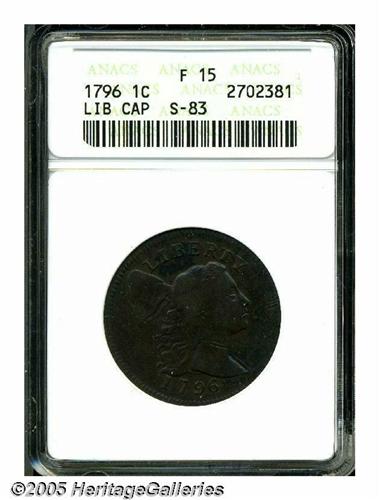 <B>1796<1C> Liberty Cap Fine 15 ANACS.</B></I> S-83, R.4. A mahogany-brown example of this scarce variety, a few small areas of faintly granular charcoal patina do not distract. Quite sharp, all legends are bold, and the hair has ample definition. A couple of minor marks at 3 o'clock and on the neck are of no consequence.
