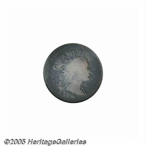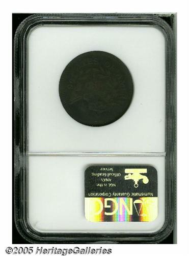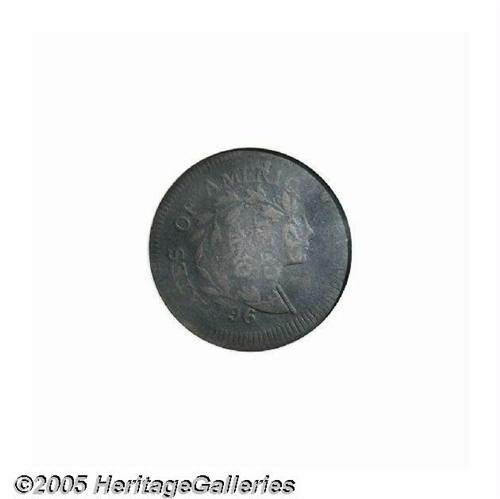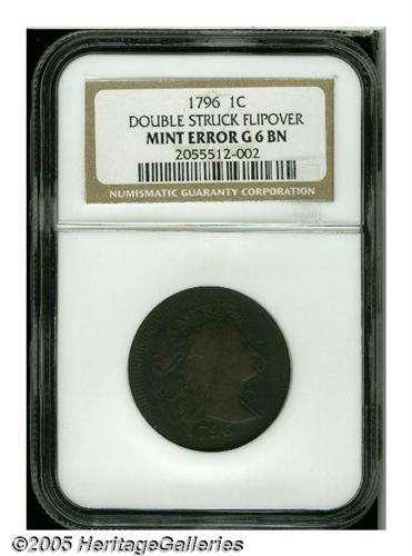 <B>1796<1C> Liberty Cap--Flipover Double Strike--Good 6 NGC.</B></I> S-82, High R.4. Close date, leaf touches F in OF. This Large Cent was initially struck approximately 10% off center toward 11 o'clock. The error was detected by mint personnel, and the piece was cent through the dies a second time, this time properly centered. On the obverse (relative to the second strike) ES OF AMERI is visible from the initial strike, and on the reverse, Liberty's profile, pole, and the 796 in the date are recognizable from the first impression of the dies. A deep brown example that has a rough texture to the fields near the second strike portrait.