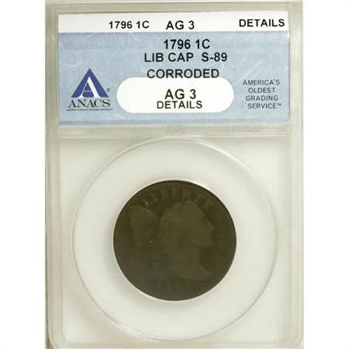<B>1796 1C Liberty Cap--Corroded--ANACS. AG3 Details.</B></I> S-89.<B> </B></I>NGC Census: (0/0). PCGS Population (0/1). (#35774)<BR><BR><b>Shipping:</b> Coins & Currency (<a target="_blank" href="http://www.heritageauctions.com/common/shipping.php">view shipping information</a>)