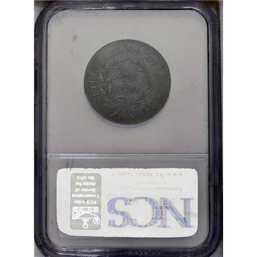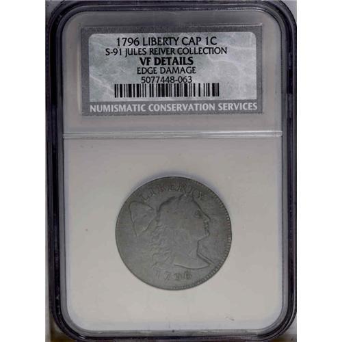 <B>1796<1C> Liberty Cap. S-91, B-1, R.3--Edge Damage--NCS. VF Details. VG10 EAC.</B></I> Smooth, mottled olive, maroon, and steel surfaces with excellent eye appeal. An intermediate die state with minor die bulges, scaling, and other slight defects.<BR><I>Ex: Del Bland (8/14/1969).</B></I> Envelope Included.