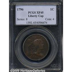 <B>1796 1C Liberty Cap XF45 PCGS.</B></I> S-91, R.3. A pleasing example of this very scarce date; an elusive issue in higher circulated grades. Intermingled tan, olive, and darker brown color on the obverse with mostly darker brown on the reverse. Some very light abrasions and minor corrosion is noted, especially on the obverse. A small planchet depression in the surface is visible just northeast of T in CENT.