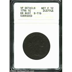 1796 1C Reverse of 1795--Corroded--ANACS. VF Details, Net Fine 12. S-116, High R.5. An important Draped Bust Cent despite the impairment, both sides exhibit generally bold definition. The reverse is not as sharply defined as the obverse, but all design elements are readily evident and the denomination ONE CENT is mostly bold. There are no sizeable circulation marks, but the surfaces are rough and pitted from corrosion with crimson and green colored verdigris in some of the recesses. Noyes' 1991 Condition Census, which is based on EAC grading standards, reads: 40; 35; 20; 20; 15; 15; 15; 12; 12. Important notice: We expect to be auctioning lots at the rate of 200-250 per hour. Sometimes eBay Premier live bid software cannot keep up with that pace, so we strongly recommend that you place a realistic proxy bid now as insurance to avoid disappointment. Also please note that all Heritage/CAA lots purchased through eBay Premier carry a 20% Buyer's Premium. Please make sure you read the Terms and Conditions.