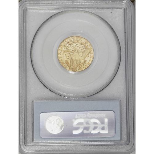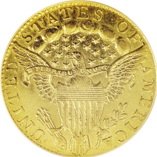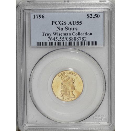 <B>1796<$2 1/2> No Stars AU55 PCGS.</B></I> Breen-1, Breen-6113, Bass-3002, High R.4. This example is an earlier die state with complete lower curls and traces of the obverse die crack from the border at 9 o'clock. The first 1796 quarter eagles were struck in September 1796 with additional examples coined in December. The two deliveries were dated September 22 and December 8, consisting of 66 coins and 897 coins, respectively. It is believed that the 66 coins were all from the first die variety, described as Bass-3001 in the Bass Sylloge, and still a major rarity today. The December delivery were all examples of this Bass-3002 variety, and the third delivery of 432 coins dated January 14, 1797 were all the Bass-3003 variety, the 1796 With Stars coinage. These are the actual figures currently recorded in the <I>Guide Book.</B></I> Today, approximately 10% of each delivery still exist, meaning that just under 100 of these 1796 No Stars coins can still be located.<BR> The inaugural design was most likely engraved by Robert Scot. These coins feature a representation of Liberty in the form of a female figure in profile view facing right, wearing a cloth cap, LIBERTY above and the date below. Liberty has a cameo appearance in a plain field without stars. This is the only No Stars obverse design within the gold coinage series, and one of few within the entire series of United States coinage. Other examples include the Gobrecht Liberty Seated design of 1836 silver dollars, also used for certain half dimes and dimes dated 1837 and 1838.<BR> This obverse design follows exactly the law established by the Mint Act of 1792, section 10, which stated: "Upon one side of each of the said coins there shall be an impression emblematic of liberty, with an inscription of the word Liberty, and the year of the coinage." The reverse features the Heraldic Eagle as its central device, taken from the Gre