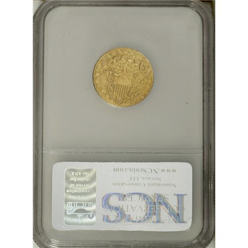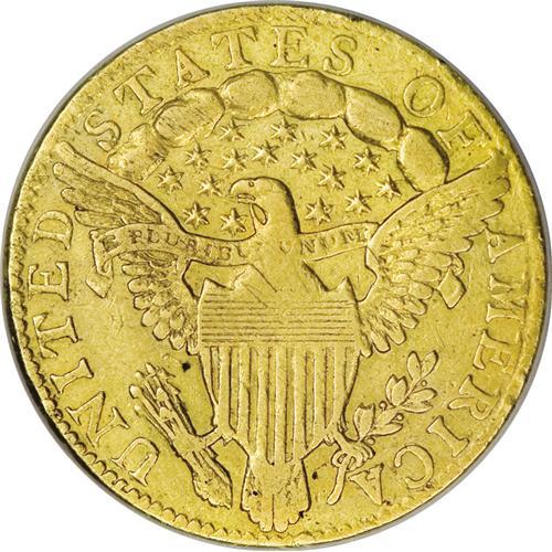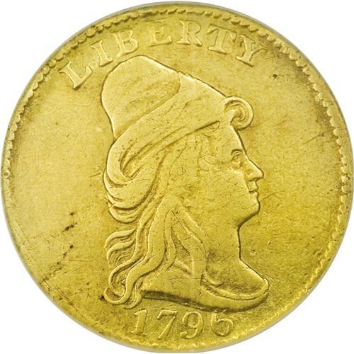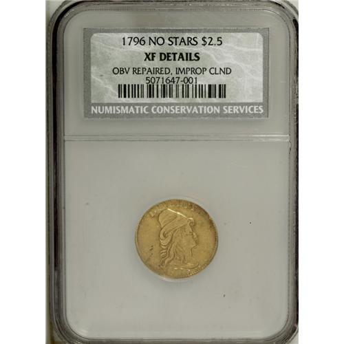 <B>1796 $2 1/2 No Stars--Obverse Repaired, Improperly Cleaned--NCS. XF Details.</B></I> Breen-1, Breen-6113, Bass-3002, BD-2, High R.4. The key identifier of this variety is that the arrowheads extend just about to the end of N of UNITED. This coin has three distinctions. It is the first precious-metal coin without stars issued for circulation by the United States prior to 1836; it is the first to show the heraldic eagle; and is the earliest made showing 16 reverse stars, apparently honoring Tennessee's admission to the Union.<BR> Peach-gold surfaces are imbued with wisps of orange and light green, and reveal fine inoffensive hairlines, especially on the obverse. The design elements retain fairly nice detail; most of E PLURIBUS UNUM is strong, as are the eagle's wing feathers. A repair appears to have been made at the lower left obverse rim. All in all, a decent one-year type coin, despite the NCS disclaimer.<BR><BR><b>Shipping:</b> Coin/Currency (<a target="_blank" href="http://www.heritageauctions.com/common/shipping.php">view shipping information</a>)