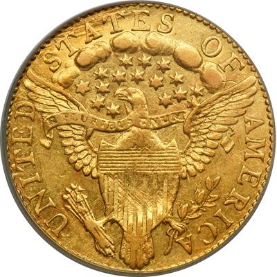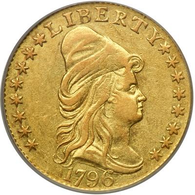 Designed by Robert Scot, the 1796 quarter eagle features the capped head ("bust") of Liberty looking right. The field has 16 stars arranged 8 + 8.