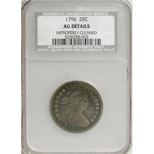 <B>1796 25C --Improperly Cleaned--NCS. AG Details.</B></I> B-2, R.3. The 1796 quarter is a collector classic. It is the first date of the denomination, the sole 18th century date, and the only date of the Small Eagle reverse type. This example has a bold date and a full complement of stars. The reverse has greater wear, although about half of the letters in the legend are distinct. Perhaps darkened to conceal a mild past cleaning.<BR><I>From The John Stimson, Sr. Collection, Part Two.</B></I><BR><BR><B>Coin Engraver:</B> Robert Scot<BR><BR><b>Shipping:</b> Coins & Currency (<a target="_blank" href="http://www.heritageauctions.com/common/shipping.php">view shipping information</a>)