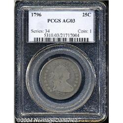 <B>1796<25C> AG3 PCGS.</B></I> B-2, R.3. This is a pleasing pewter gray example of the first quarter dollar issued by the Philadelphia Mint. Like the others in the sale, this is a pleasing example without defects. Nearly all of the obverse design is complete, including a bold date with border details below. The reverse is nearly complete with only UNI and part of the left branch of the wreath absent. Some other letters are merged with the border, but all are at least partially visible. <BR><BR><B>Important notice:</B> Heritage usually auctions material at the rate of 200-250 lots per hour. On some occasions eBay Live bid software or the Internet may not be able to keep up with the pace of the auction. We recommend placing a realistic absentee bid now as insurance to avoid disappointment. Occasionally the auctioneer may eliminate or reject an eBay Live bid, and the auctioneer may also reopen a lot after the close of the eBay live bidding (usually because we missed an audience bid), and may reject your bid even if it shows you as the winning bidder. By bidding via eBay Live, you agree that Heritage may award the lot to another bidder at its sole discretion under the circumstances described above or any other reasonable circumstances. Since eBay bids are not shown to us until we open the lot on the floor, we treat those bids just like floor bids. In most cases the floor responds before the eBay bid is presented to us, due to Internet lag time, so for consistency we have made it a policy that floor bids are always considered first over tie eBay live bids. Also please note that all Heritage lots purchased through eBay Live carry a 20% Buyer's Premium. Please make sure you read the Terms and Conditions before you bid.
