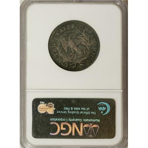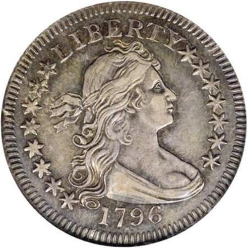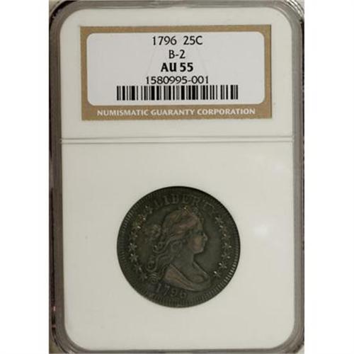 <B>1796 25C AU55 NGC.</B></I> High 6, B-2, R.3. The 6 in the date nearly touches the bottom of the drapery, and star 15 is twice as far from the bust as it is on the B-1 Low 6 quarter. The T and Y in LIBERTY do not touch on the B-2, although they are close, while they merge on the B-1 variety. On the B-2 the digits of the date are equidistant, while on the B-1 the date is spaced 1 79 6, with the 7 and 9 too close. The tiny mintage of 6,146 pieces appears to have been rather unevenly split between the considerably rarer B-1 and the more-available B-2, both of which share a common reverse. However, the B-2 usually shows weakness on the eagle's head, while the B-1 occasionally shows perfect impressions that lack mentionable weakness.<BR> While the year 1796 is a year replete with rarities in copper, silver, and gold denominations, the 1796 quarter occupies a unique niche as the premier first-year silver coin of that denomination, one that would not be minted again until 1804. Accordingly, while some other coin denominations minted during the year may be technically rarer, both varieties of 1796 quarter are in demand as one-year type coins, and due to their low mintage, both varieties are considered rare. <BR> In both technical and aesthetic terms this is a simply gorgeous piece, with light pinkish-gray patina on the obverse, to which the reverse adds some iridescent steel-blue and green coloration. Considerable mint luster remains under the light patina, and the few adjustment marks through the eagle's head, the O of OF, the wreath nearby, and the lower clouds are not particularly distracting. The eagle's head is typically struck. This fine Choice AU 1796 quarter is destined to form the centerpiece of a fine and memorable collection.<BR><BR><BR><B>Coin Engraver:</B> Robert Scot<BR><BR><b>Shipping:</b> Coins & Currency (<a target="_blank" href="http://www.heritageauctions.com/common/shipping.php">view shipping information</a>)