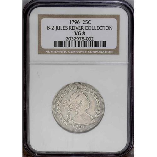 <B>1796<25C> B-2, R.3. VG8 NGC. Die State II.</B></I> High 6; Small Eagle. The final star is comparatively distant from the bust. Original lavender-mauve patina embraces this attractively detailed example. The low mintage of 6,146 pieces ensures the scarcity of this important issue, which is a single year type and is also the first year of the denomination. A few faint hairlines from past handling, but the surfaces are reasonably attractive for a coin in this grade. This is one of the most difficult type coins to obtain. <BR><I>Ex: Bowers and Merena (1/1984), lot 277; Jim McGuigan (11/1986).</B></I> Envelope Included.