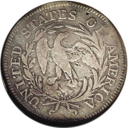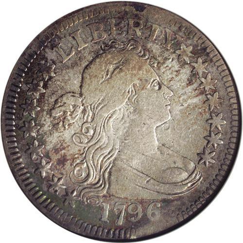 <B>1796<25C>--Bent--ANACS. Fine 12 Details.</B></I> B-1, R.5. The more difficult of the two known die pairings for the 1796 Quarter, which is the only date of the Small Eagle type, and one of the most difficult silver type coins to acquire. The 1796 is also important as the first Quarter issue, excluding the non-collectible 1792 patterns. This wavy and faintly hairlined representative has a slate-gray reverse, while the obverse is adorned with iridescent lemon, apple-green, and ruby-red tints. Liberty's hair has pleasing definition, and heavy wear is only found on a portion of the obverse rim at 5:30. 1796 quarters of either variety in any condition are highly desirable, and a Browning-1 with bold borders and clear types merits bidder attention.