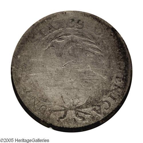 <B>1796<25C>--Damaged--ANACS. Good 4 Details.</B></I> B-2, R.3. A slight depression on the obverse center is accompanied by parallel vertical scuffs. A few faint obverse pinscratches are of lesser interest. Moderately toned in cream-gray colors, with hints of deeper lilac hues near the rims. The date is bold, LIBERTY and UNITED are faint. Famous as a one-year type, the 1796 is the only date with a Small Eagle reverse, and is the only date struck during the initial ten years of mint operation. Silver Dollars were the denomination of choice in the late 1790s, and depositors of bullion at the Federal mint simply did not want Quarters in return, as their smaller size and greater count made them less convenient.