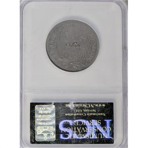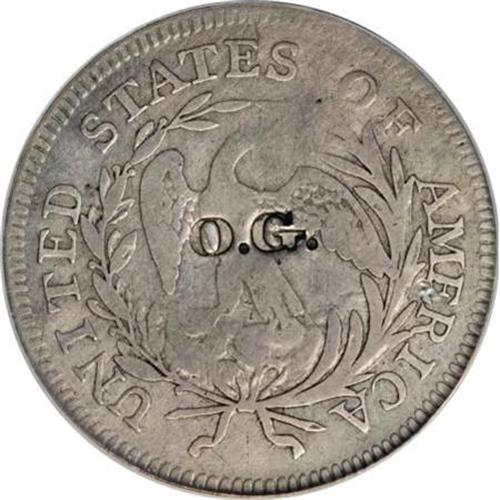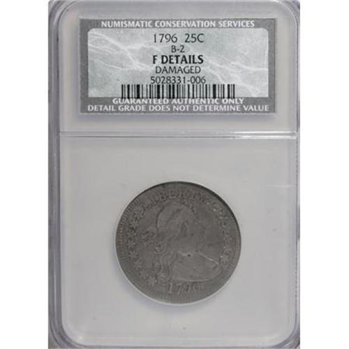 <B>1796 25C --Damaged--NCS. Fine Details.</B></I> B-2, R.3. The initials O.G. are deeply counterstamped onto the central reverse, which flattens the corresponding portion of the obverse. The right obverse field is tooled, as is a spot on Liberty's neck. All legends and stars are clear, as are the majority of the dentils.<BR><BR><B>Coin Engraver:</B> Robert Scot<BR><BR><b>Shipping:</b> Coins & Currency (<a target="_blank" href="http://www.heritageauctions.com/common/shipping.php">view shipping information</a>)
