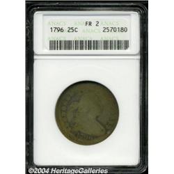 <table><tbody><tr><td><table> <TR><TD width="100%"><TABLE cellSpacing=1 cellPadding=3 width="100%" border=0><TBODY><TR><TD width="100%" bgColor=#79735c><FONT face=arial color=#ffffff size=3><B>Description</B> </FONT></TD></TR><TR><TD width="100%" bgColor=#ffffff><FONT face=arial size=2><B>1796 25C Fair 2 ANACS.</B></I> B-2, R.3. With only 6,146 pieces produced and this design only struck in this single year, the 1796 has always been a popular coin for collectors in all grades. This is a heavily worn example that shows almost none of the lettering on LIBERTY on the obverse or UNITED STATES OF on the reverse. However, the date is still strong and complete. The surfaces have taken on a rich lime-green patina with deeper gray accents around the devices that remain. Uncleaned.<BR><I>From The Charles Buck Collection.</B></I> </FONT></TD></TR></TBODY></TABLE></TD></TR></TBODY></TABLE><BR><A name=PricesRealized></A><TABLE cellSpacing=0 cellPadding=0 width="100%" bgColor=#000000 border=0><TBODY><TR><TD width="100%"><TABLE cellSpacing=1 cellPadding=3 width="100%" border=0><TBODY><TR><TD width="100%" bgColor=#79735c><A name=PR><FONT face=arial color=#ffffff size=3><B>Previous Prices from Heritage Auctions</B> </FONT></A></TD></TR><TR><TD bgColor=#f6f6ed><TABLE cellSpacing=0 cellPadding=0 width="100%" border=1><TBODY><TR><TD align=middle width="33%"><B>Date</B></TD><TD align=middle width="33%"><B>Service</B></TD><TD align=middle width="33%"><B>Price</B></TD></TR><TR bgColor=whitesmoke><TD width="33%"><B>05/03/2003</B></TD><TD width="33%">ANACS</TD><TD width="33%">$2,558.75</TD></TR></TBODY></TABLE></TD></TR><TR><TD bgColor=#ffffff><FONT face=arial size=1 ?>PLEASE NOTE: All prices realized reflect the final hammer price PLUS the buyer's premium in auctions that charge a buyer's premium. Each item has a notation at the top of the listing indicating whether that lot included a buyer's premium. Example: A item that sells with a final hammer price of $100 and a 20% buyer's premium will display with a price realized of $120. All information listed is intended to be as accurate as possible, but errors are possible. Please use this guide carefully and inform us of any inaccuracies. </FONT></TD></TR></TBODY></TABLE></TD></TR></TBODY></TABLE><BR><TABLE cellSpacing=0 cellPadding=0 width="100%" bgColor=#000000 border=0><TBODY><TR><TD width="100%"><TABLE cellSpacing=1 cellPadding=3 width="100%" border=0><TBODY><TR><TD width="100%" bgColor=#79735c colSpan=6><FONT face=arial color=#ffffff size=3><B>Price Guide*</B> </FONT></TD></TR><TR bgColor=#f6f6ed><TD align=middle><B>Grade</B> </TD><TD align=middle><B>Coin World<BR>(Trends)</B> </TD><TD align=middle><B>Numismedia<BR>Retail</B> </TD><TD align=middle><B>Numismedia<BR>Wholesale</B> </TD><TD align=middle><B>Coin<BR>Universe</B> </TD><TD align=middle><B>Heritage<BR>Value Index</B> </TD></TR><TR bgColor=#ffffff><TD align=middle>1</TD><TD align=right>---</TD><TD align=right>---</TD><TD align=right>---</TD><TD align=right>---</TD><TD align=right>$981.25</TD></TR><TR style="FONT-WEIGHT: bold" bgColor=#cccfdd><TD align=middle>2</TD><TD align=right>---</TD><TD align=right>---</TD><TD align=right>---</TD><TD align=right>---</TD><TD align=right>$1,962.50</TD></TR><TR bgColor=#ffffff><TD align=middle>3</TD><TD align=right>---</TD><TD align=right>---</TD><TD align=right>---</TD><TD align=right>---</TD><TD align=right>$3,007.81</TD></TR><TR bgColor=#ffffff><TD colSpan=6><FONT size=1>*All information listed is intended to be as accurate as possible, but errors are possible. No item may be returned or refused based on this information which is provided as a service to our customers. You should contact each pricing source directly to determine the accuracy of this information. </FONT></TD></TR></TBODY></TABLE></TD></TR></TBODY></TABLE><BR><TABLE cellSpacing=0 cellPadding=0 width="100%" bgColor=#000000 border=0><TBODY><TR><TD width="100%"><TABLE cellSpacing=1 cellPadding=3 width="100%" border=0><TBODY><TR><TD width="100%" bgColor=#79735c><FONT face=arial color=#ffffff size=3><B>Population Guide</B> </FONT></TD></TR><TR bgColor=#ffffff><TD align=middle><!-- Begin Output of Population Grid--><TABLE cellSpacing=0 cellPadding=0 width="100%" border=0><TBODY><TR><TD vAlign=center><TABLE cellSpacing=0 width="100%" border=1 cellsadding="3"><TBODY><TR><TD vAlign=center><TABLE cellSpacing=0 cellPadding=3 width="100%" border=1><TBODY><TR><TD vAlign=center align=middle bgColor=#f0f1e8 colSpan=2 <CENTER><FONT face=Arial size=2><B>PCGS Pop </B></FONT><CENTER></CENTER></TD><TD vAlign=center align=middle bgColor=#f0f1e8 colSpan=2><CENTER><FONT face=Arial size=2><B>NGC Pop</B></CENTER></FONT></TD></TR><TR><TD vAlign=center><FONT face=Arial size=2>(2)</FONT> </TD><TD vAlign=center align=right><FONT face=Arial size=2>5</FONT> </TD><TD vAlign=center><FONT face=Arial size=2>(2)</FONT> </TD><TD vAlign=center align=right><FONT face=Arial size=2>3</FONT> </TD></TR><TR><TD vAlign=center><FONT face=Arial size=2>(>2)</FONT> </TD><TD vAlign=center align=right><FONT face=Arial size=2>237</FONT> </TD><TD vAlign=center><FONT face=Arial size=2>(>2)</FONT> </TD><TD vAlign=center align=right><FONT face=Arial size=2>115</FONT> </TD></TR></TBODY></TABLE></TD></TR></TBODY></TABLE></TD></TR></TBODY></TABLE><!-- End Output of Population Grid--></TD></TR></TBODY></TABLE></TD></TR></TBODY></TABLE><BR><TABLE cellSpacing=0 cellPadding=0 width="100%" bgColor=#000000 border=0><TBODY><TR> <font color='#000000'><span style='background-color: #FFFFFF'><td bgcolor='#FFFFFE'> Important notice: Heritage usually auctions material at the rate of 200-250 lots per hour. On some occasions eBay Live bid software or the Internet may not be able to keep up with the pace of the auction. We recommend placing a realistic absentee bid now as insurance to avoid disappointment. Occasionally the auctioneer may eliminate or reject an eBay Live bid, and the auctioneer may also reopen a lot after the close of the eBay live bidding (usually because