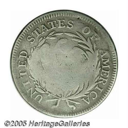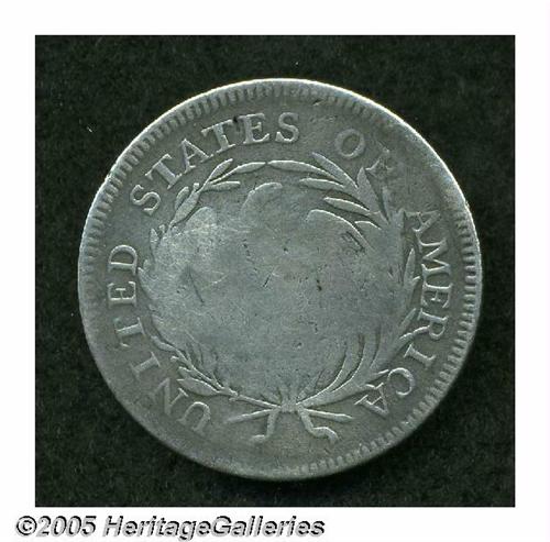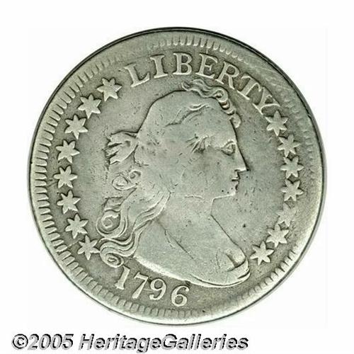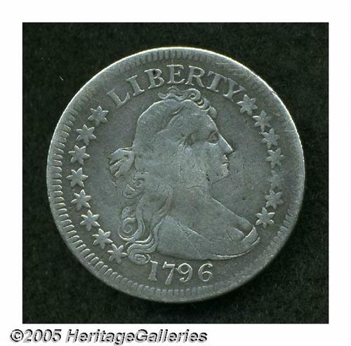 <B>1796<25C> Fine 12 Repaired Whizzed Uncertified.</B></I> B-1, R.6. The more rare of the two known varieties for the 1796 Quarter, the only date of the Small Eagle type and thus one of the most difficult silver type coins to acquire. The 1796 is also important as the first Quarter issue, excluding non-collectible 1792 patterns. This slate-gray piece is grainy and has faint swirling marks from a past thorough whizzing. The central reverse has weak definition, and the obverse has likely been smoothed in places to remove marks. Nonetheless, an affordable opportunity to fill a formidable hole in an ambitious early type set.