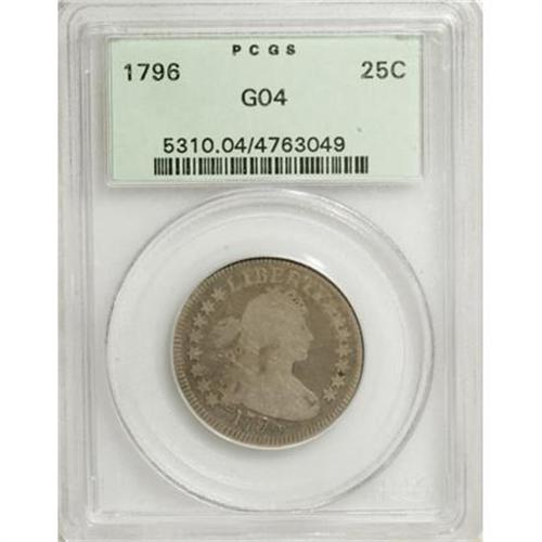<B>1796 25C Good 4 PCGS.</B></I> B-2, R.3. The High 6 variety is seen more frequently than the Low 6. Certain issues are recognized by unusual characteristics. The 1796 quarter is one of them, almost invariably found with a sharp obverse and weaker reverse than can sometimes appear a full grade less. Such is the case with this piece. The obverse appears to be fully VG, and the reverse just makes the Good level.<BR> The surfaces have pleasing, natural light gray color, deeper in the fields. The obverse has a few primarily insignificant marks. It also seems that PCGS graded the coin slightly lower due to a vertical scratch on the reverse. Still and all, this is an attractive and desirable 1796 quarter to represent the early history of the denomination struck in the U.S. Mint at Philadelphia.<BR><I>From The Casa Becca del Norté Collection.</B></I><BR><BR><B>Coin Engraver:</B> Robert Scot<BR><BR><b>Shipping:</b> Coins & Currency (<a target="_blank" href="http://www.heritageauctions.com/common/shipping.php">view shipping information</a>)