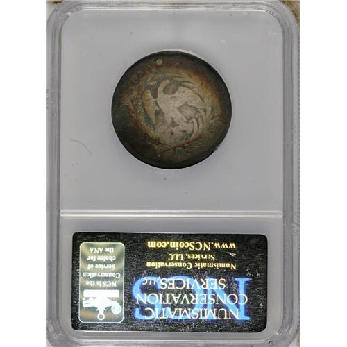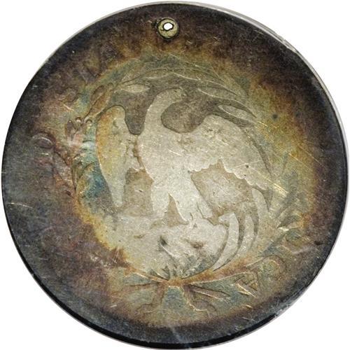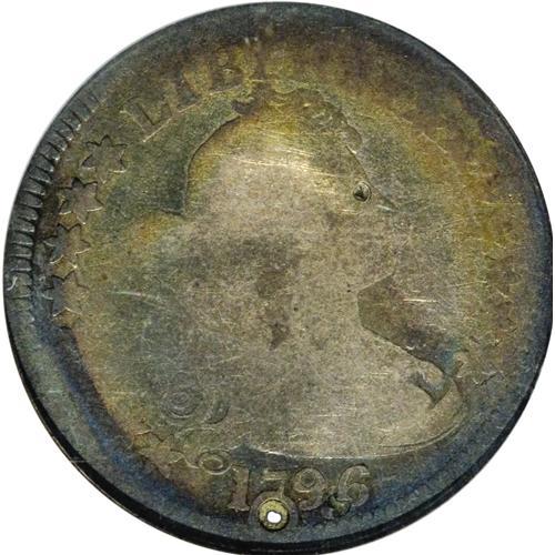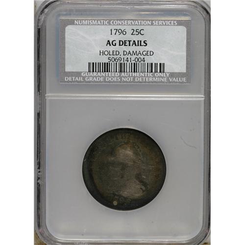 <B>1796 25C --Holed, Damaged--NCS. AG Details.</B></I> Low 6. B-1, R.5. This is an example of the rare Low 6 variety with the digit 6 approximately centered between the drapery and the border. The obverse is pierced below the digit 7, and two other attempted punctures were not successful. Otherwise, the surfaces are actually smooth and pleasing with ancient iridescent toning that provides an attractive appearance.<BR><BR><b>Shipping:</b> Coins & Currency (<a target="_blank" href="http://www.heritageauctions.com/common/shipping.php">view shipping information</a>)