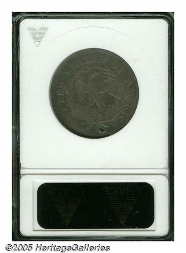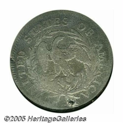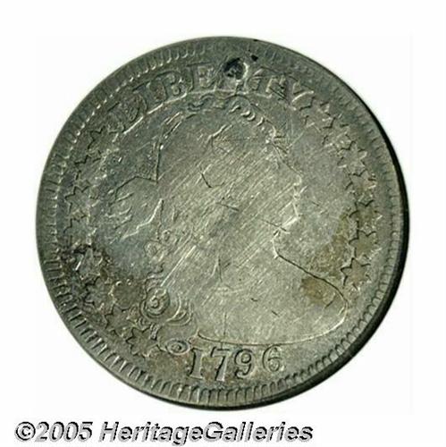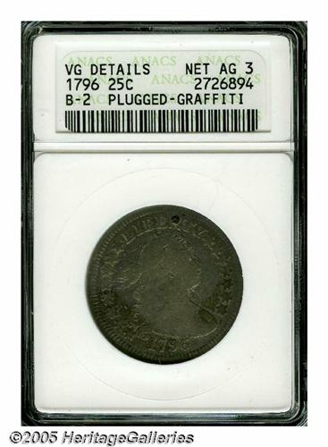 <B>1796<25C>--Plugged, Graffiti--ANACS. VG Details, Net AG3.</B></I> B-2, R.3. Holed and crudely repaired over the R in LIBERTY with several pinscratches and carvings on the obverse. The reverse is quite worn, although most detail remains. The obverse features a full date and stars. A famous issue, and a key to an early silver type set.