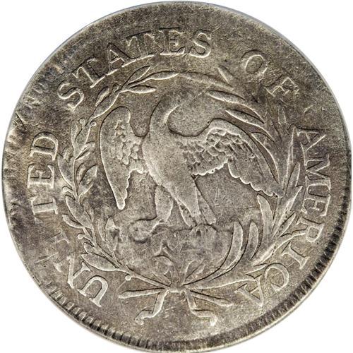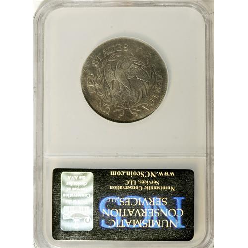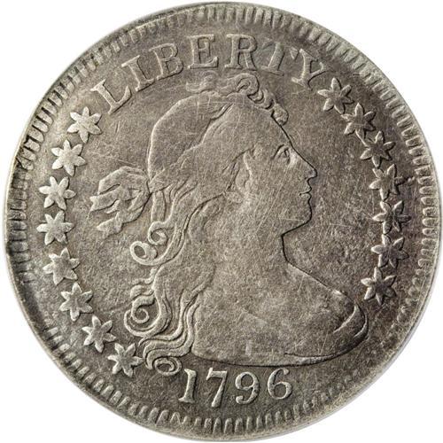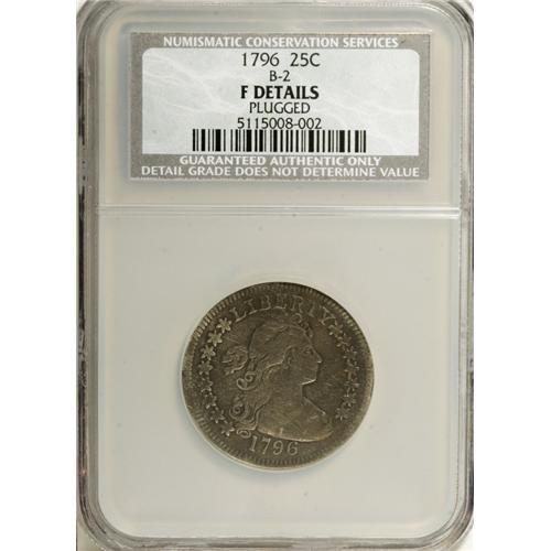 <B>1796 25C --Plugged--NCS. Fine Details.</B></I> B-2, R.3. This one-year-type comes in two varieties that share the same reverse. The B-2 variety of the coin in this lot is confirmed by a high 6 in the date that is very near, but does not touch, the bust, and in LIBERTY, the T and Y do not touch at the top.<BR> According to mint records (Bullion Journal A, National Archives), only 6,146 pieces were coined in four batches: 1,800 coins were delivered April 9, 1796 per warrant 6; another 2,530 pieces were delivered May 27, 1796 under Warrant 63; 1,564 specimens were in a June 14, 1796 delivery per Warrant 65; and the remaining 252 coins were delivered on February 28, 1797 under Warrant 81.<BR> Finely hairlined surfaces on this coin display light to medium gray toning, and relatively strong Fine details, especially in the mid and lower potion of Liberty's hair and the internal part of the eagle's wings. The design elements are well centered on the planchet, and most of the obverse dentilation is strong, as is typical for the type. The coin appears to have been plugged at 12 o'clock on the obverse, with the E in LIBERTY expertly repaired; the plug's outline can barely be discerned below the bowknot on the reverse. Some repair also appears to have been attempted at the left reverse rim. A 1796 quarter is necessary for the completion of a U.S. type set.<BR><BR><b>Shipping:</b> Coins & Currency (<a target="_blank" href="http://www.heritageauctions.com/common/shipping.php">view shipping information</a>)