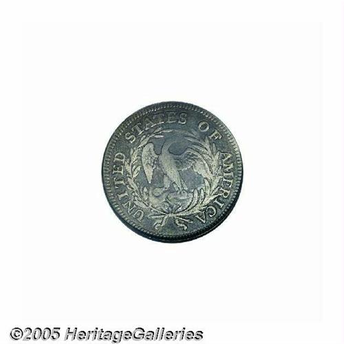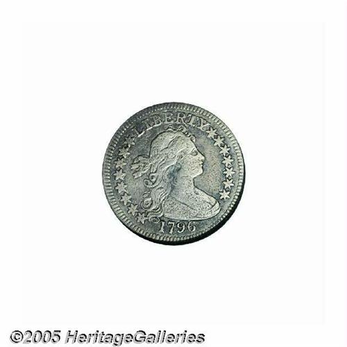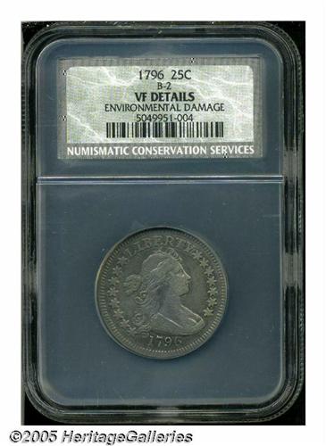 <B>1796<25C> VF Details, Environmental Damage, NCS.</B></I> High 6. B-2, R.3. The High 6 variety is the more commonly encountered of the two date variants seen on 1796 quarters. However, the word "commonly" should be understood in the context of the two varieties of 1796 quarters, for there is nothing common about this date. Only 6,146 pieces were struck of this one-year type. This piece has pitting on the obverse, but none on the reverse, leading one to conclude that the coin probably laid face-up and exposed to the elements for an extended period of time. Likewise, whatever the coin laid on protected the reverse. Evenly worn, except on the eagle's head, which is always weak, the fields are light to medium gray with brilliantish-silvery accents over the highpoints of the design.