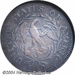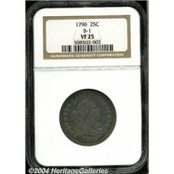 <B>1796<25C> VF25 NGC.</B></I> B-1, R.6. This is an original example with violet-brown toning that yields to emerald-green and crimson-pink colors within the obverse fields. Both sides are well centered and the definition is bold for the Very Fine grade level. There are a few scattered abrasions, none of which are inconsistent with a coin that saw this extensive wear. The 1796 quarter was produced to the extent of only 6,146 pieces. This was the first and only delivery of the Draped Bust, Small Eagle variety, a fact that explains the importance of this issue among type collectors and quarter specialists alike. <BR><BR><B>Important notice:</B> Heritage usually auctions material at the rate of 200-250 lots per hour. On some occasions eBay Live bid software or the Internet may not be able to keep up with the pace of the auction. We recommend placing a realistic absentee bid now as insurance to avoid disappointment. Occasionally the auctioneer may eliminate or reject an eBay Live bid, and the auctioneer may also reopen a lot after the close of the eBay live bidding (usually because we missed an audience bid), and may reject your bid even if it shows you as the winning bidder. By bidding via eBay Live, you agree that Heritage may award the lot to another bidder at its sole discretion under the circumstances described above or any other reasonable circumstances. Since eBay bids are not shown to us until we open the lot on the floor, we treat those bids just like floor bids. In most cases the floor responds before the eBay bid is presented to us, due to Internet lag time, so for consistency we have made it a policy that floor bids are always considered first over tie eBay live bids. Also please note that all Heritage lots purchased through eBay Live carry a 20% Buyer's Premium. Please make sure you read the Terms and Conditions before you bid. </span></font></tr></table></td></tr></table>