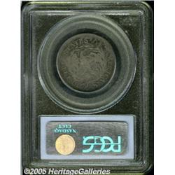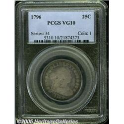 <B>1796 25C VG10 PCGS.</B></I> B-2, R.3. Browning-2 is the more frequently encountered die marriage of the 1796 Quarter, and it is readily identifiable by a high 6 in the date. It is always the sign of an important sale when we can offer a problem-free representative of this low mintage (6,146 pieces), one-year type. Moderate to heavy wear is evenly distributed over both sides with all major design elements at least outlined. The obverse rim is sharp, as is that on the reverse in all but one or two areas. The number of light to moderate abrasions is consistent with an early Quarter that saw this extensive wear, and, with rich charcoal-gray and deep blue-green toning that lightens over the raised features, neither side reveals any singularly mentionable blemishes. Worthy of a strong bid.
