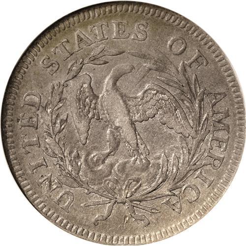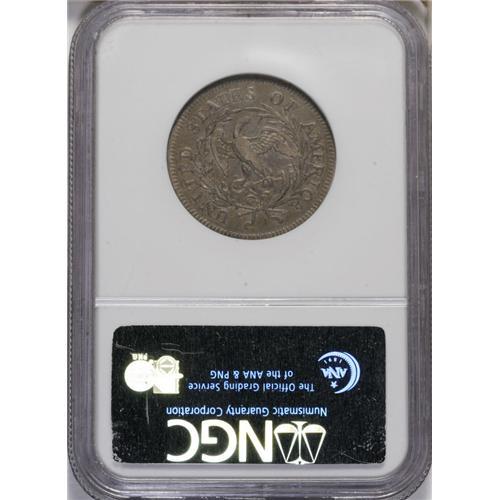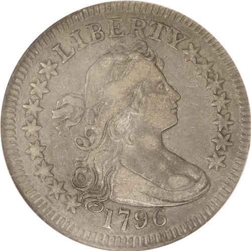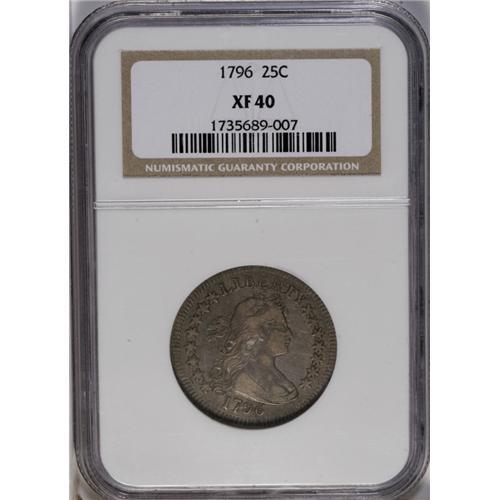 <B>1796<25C> XF40 NGC.</B></I> High 6. B-2, R.3. Two varieties are known for the Draped Bust, Small Eagle quarter dollar coinage, a single year design and the first year of issue for the denomination. The two varieties can be quickly distinguished by the position of the digit 6, high and almost touching the bust on this B-2 variety, and lower, nearly centered between the bust and border, on the rarer B-1 variety. The next quarter dollar issue, struck eight years later in 1804, has the new Heraldic Eagle design. Mintage of these early issues was limited with just 6,146 quarters produced in 1796 and 6,738 more in 1804. It is reasonable to assume that the 1796 calendar year mintage corresponds with the actual production of coins bearing the 1796 date. One researcher, Robert Hilt, claimed that the 1796 B-1 variety was actually struck in 1804! He further claimed that the survival rate for the early quarter dollars was only 1.32%, a figure that is much too low. His figures suggest that only about 170 quarter dollars survive from both years, 1796 and 1804. The actual survival rate is probably more in the order of 8% to 10%, or about 1,000 to 1,200 examples for both years.<BR> The present example is an attractive, well balanced, copper-gray representative, perfectly centered, with strong dentils around both sides. Faint mint luster still radiates from the surfaces, and examination under a loupe reveals no marks worthy of singular mention. The eagle's head and clouds below show the characteristic softness always found on the reverse of the B-2, the more common of the two varieties for the year. A desirable coin sure to appeal to a number of audiences.