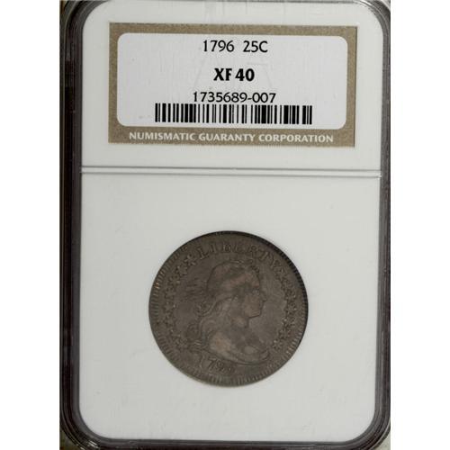 <B>1796 25C XF40 NGC.</B></I> High 6. B-2, R.3. Two varieties are known for the Draped Bust, Small Eagle quarter dollar coinage, a single year design and the first year of issue for the denomination. The two varieties can be quickly distinguished by the position of the digit 6, high and almost touching the bust on this B-2 variety, and lower, nearly centered between the bust and border, on the rarer B-1 variety. The next quarter dollar issue, struck eight years later in 1804, has the new Heraldic Eagle design. Mintage of these early issues was limited with just 6,146 quarters produced in 1796 and 6,738 more in 1804. It is reasonable to assume that the 1796 calendar year mintage corresponds with the actual production of coins bearing the 1796 date. One researcher, Robert Hilt, claimed that the 1796 B-1 variety was actually struck in 1804! He further claimed that the survival rate for the early quarter dollars was only 1.32%, a figure that is much too low. His figures suggest that only about 170 quarter dollars survive from both years, 1796 and 1804. The actual survival rate is probably more in the order of 8% to 10%, or about 1,000 to 1,200 examples for both years.<BR> The present example is an attractive, well balanced, copper-gray representative, perfectly centered, with strong dentils around both sides, which is typical for the issue. Faint mint luster still radiates from some of the recessed areas, and examination under a loupe reveals no marks worthy of singular mention. For possible pedigree purposes, we point out a small linear mark equidistant between star two and the dentils, and another just to the left of the middle of the right ribbon coming out of the bowknot. Nice definition is displayed in most of Liberty's hair, and in the eagle's wing feathers. A desirable coin sure to appeal to a number of audiences.<BR><BR><b>Shipping:</b> Coin/Currency (<a target="_blank" href="http://www.heritageauctions.com/common/shipping.php">view shipping information</a>)
