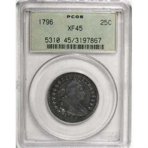 <B>1796 25C XF45 PCGS.</B></I> B-2, R.3. The more available of the two die pairings for the issue, with even spacing on the date and the 6 high relative to the B-1 obverse. On the reverse, the small eagle shows indistinctness at the head, a trait more frequently associated with the B-2 pieces than their B-1 counterparts. Of course, each variety is scarce in an absolute sense, and overwhelming demand for examples of the only 18th century quarter has rendered the B-2 the die pairing of choice for most type collectors, who leave B-1 coins to the specialists.<BR> In the early years of the United States Mint, the quarter dollar was a neglected denomination. With so many two reales coins and "two-bit" wedges circulating in the former colonies, the American equivalent faced stiff competition, and by imitating the Spanish standard, the Mint created no incentive for individuals to turn the pieces in for recoinage. The result, Neil Carothers wrote in his <I>Fractional Money</B></I>, was a dismal situation: "The hopes of Jefferson and Hamilton that a domestic coinage would displace foreign gold and silver were not realized in their time. The coinage was very small, and the [M]int was regarded as a costly failure."<BR> This Choice XF representative is well-defined by the standards of the issue. The surfaces are richly toned violet and slate-blue with paler silver-gray at the lightly worn highpoints. The surfaces are pleasingly preserved, with no individually mentionable marks or abrasions on either side. With its excellent visual appeal and inherent desirability, this is a coin that should inspire spirited bidding.<BR><BR><B>Coin Engraver:</B> Robert Scot<BR><BR><b>Shipping:</b> Coins & Currency (<a target="_blank" href="http://www.heritageauctions.com/common/shipping.php">view shipping information</a>)