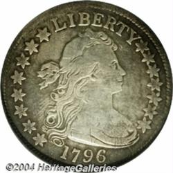 <B>1796<50C> 15 Stars Fine 12 Details, Repaired, Improperly Cleaned, NCS.</B></I> O-101, R.5. The half dollars of 1796-97 are one of the most highly regarded and valuable type coins in all of U.S. numismatics. Mint records indicate that a total of just 3,918 pieces were made for both dates combined. Four varieties are known, a 15 star and a 16 star variety for the 1796 issue, and two 1797 varieties based on slight alignment differences of the reverse wreath. Published estimates on the number of extant specimens for this two-year design type vary from approximately 100 to 300 examples. Our own research has accounted, thus far, for slightly more than 220 examples. These range throughout the grading continuum, but show a relatively high number in the VF category. A number of these survivors have been mishandled, exhibiting plugs, scratches, graffiti, rim damage, harsh cleaning, etc. The current example is toned light to medium gray around the peripheral fields, giving way to a silverish coloration in the centers and on the design elements. Relatively nice detail is apparent on the central devices for the designated "Fine Details" grade. The dentilation is fairly strong on both sides, save for weakness around the upper obverse, and the design elements are well centered on the planchet. Light hairlines are seen on both sides, and some vertical scratches traverse Liberty's portrait. The surfaces have been smoothed, especially in the right fields and on the adjacent central devices of each side. Some tooling also seems to be apparent around the letters MER of AMERICA. Despite the impairments, this is a respectable example for completing a type set of early U.S. coinage. <BR><BR><B>Important notice:</B> Heritage usually auctions material at the rate of 200-250 lots per hour. On some occasions eBay Live bid software or the Internet may not be able to keep up with the pace of the auction. We recommend placing a realistic absentee bid now as insurance to avoid disappointment. Occasionally the auctioneer may eliminate or reject an eBay Live bid, and the auctioneer may also reopen a lot after the close of the eBay live bidding (usually because we missed an audience bid), and may reject your bid even if it shows you as the winning bidder. By bidding via eBay Live, you agree that Heritage may award the lot to another bidder at its sole discretion under the circumstances described above or any other reasonable circumstances. Since eBay bids are not shown to us until we open the lot on the floor, we treat those bids just like floor bids. In most cases the floor responds before the eBay bid is presented to us, due to Internet lag time, so for consistency we have made it a policy that floor bids are always considered first over tie eBay live bids. Also please note that all Heritage lots purchased through eBay Live carry a 20% Buyer's Premium. Please make sure you read the Terms and Conditions before you bid. </span></font></tr></table></td></tr></table>