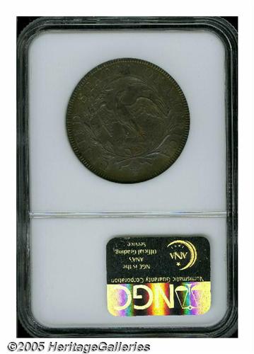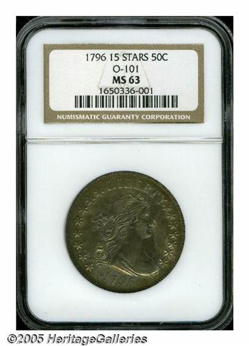 <B>1796<50C> 15 Stars MS63 NGC.</B></I> O-101, R.5. The Mint State coin offered in this lot is part of the famed Draped Bust Small Eagle half dollar series. This series consists of two dates, 1796 and 1797, each of which has two varieties. The 1796 issue with 15 obverse stars is Overton 101, that with 16 stars is classified as Overton 102. The 16 stars coin was apparently intended to commemorate Tennessee's June 1, 1796 admission to the Union as the 16th state. The two 1797 issues (Overton 101 and 102) are differentiated by the alignment of the reverse wreath in relation to the peripheral lettering.<BR> All four varieties were struck in 1797 as part of three deliveries. Mint records show that the first delivery was made on February 28, 1797 (60 coins), the second delivery on March 21 (874 coins), and the last on May 26 (2,984 coins). All of these coins were minted from silver ingots deposited by the Bank of the United States, and all of the deliveries were made to the Bank. Breen, in his <I>Complete Encyclopedia of U.S. and Colonial Coins,</B></I> theorizes that the February delivery was 1796's with 15 stars; those coins minted in March included some 1796 with 15 stars and others with 16 stars; and those coins produced in May consisted mostly of 1797-dated pieces and the last of the 1796's with 16 stars.<BR> Of the 3,918 half dollars of 1796-1797 that were minted, relatively few are thought to have survived. Estimates of extant pieces range from less than 100 to over 300 coins. Research being conducted by this cataloger (Jon Amato), has to date, accounted for close to 220 specimens in all grades. The interested reader is referred to the February 2005 issue of the <I>John Reich Journal</B></I> (Vol. 16/Issue 2, pp. 12-17) for the findings of this study.<BR> Prospective bidders on the MS63 specimen being offered in the present lot will be particularly interested in the number of Uncirculated 1796-1797 half dollar survivors, especially those of the 1796 15 stars variety. Of the 20 Mint State specimens identified in the above study, eight were of this variety.<BR> The provenance of the present coin is traced to the August 2004 American Numismatic Rarities sale (lot 418), and prior to that, to the Bowers and Merena March 1989 sale (lot 1990). Unfortunately, we are unable to conclusively trace its pedigree to any prior sales.<BR> We can, however, list some of the other Mint State 1796 15 stars half dollar appearances. One of the most notable was a PCGS Specimen 65 coin in the March 2004 Bowers and Merena sale. This piece is pedigreed to the so-called "Knoxville Collection." One of the outstanding features of this particular coin was that it lacks the obverse die crack present on virtually all other known specimens. An MS64 Prooflike specimen appeared in the Bowers and Merena April 1997 Louis E. Eliasberg Sale (lot 1673). This example is pedigreed to the John H. Clapp estate (1942) and to Benjamin H. Collins (1896).<BR> A 1796 15 stars half dollar described as "Brilliant Uncirculated" appeared in Stack's October 2002 sale (lot 22). This coin originally reposed in the collections of Reed Hawn and Lorin Parmelee. Another "Brilliant Uncirculated" example made an appearance in Stack's October 2000 sale (lot 876). This coin is pedigreed to the collections of Henry Norweb, T. James Clarke, Waldo Newcomer, and Col. E.H.R. Green. Stack's also sold an MS64 example in its May 1999 John Whitney Walter Collection (lot 1776), and a Specimen 66 out of the same collection (lot 1777). The latter coin can be traced to Max Mehl's March 1948 sale of the C.A. Allenberger Collection (lot 385), and to Thomas Elder's sale of the Peter Mougey Collection (lot 424).<BR> The Dr. E. Yale Clarke "Brilliant Uncirculated, Prooflike" 1796 15 stars half dollar appeared in Stack's October 1975 sale (lot 182), and made previous appearances in that firm's April 1969 R.L. Miles and November 1954 Anderson Dupont sales (lots 1205 and 2031, respectively). The James A. Stack coin, described as a "Proof," sold in the March 1975 Stack's sale (lot 313), and is pedigreed to the H.R. Lee (1947) and Beistle collections.<BR> The William P. Donlon Collection, sold by Abe Kosoff in November 1956, featured a 1796 15 stars half dollar described as "Uncirculated with Prooflike Luster" (lot 705). Donlon had acquired this coin out of Numismatic Gallery's June 1950 Adolphe Menjou Sale (lot 942). This firm also offered what it called the "Finest Known Brilliant Proof" out of the John M. Morris Collection (lot 868).<BR> On the present example, rich pastel multicolored toning embraces reflective surfaces. The obverse displays a melange of brassy-gold and pale-blue patination accented with splashes of green, orange, and violet. The reverse takes on slightly deeper tones of the same color pattern, being joined by rose toning and a greater display of orange splashes. The design elements are sharply struck, save for the usual softness on the feathers of the eagle's breast and left leg. The devices on each side are very well centered, and most of the dentilation is bold. The typical die crack from the obverse rim at 5 o'clock branches along the drapery to the right through the last three stars to the rim at 3 o'clock, and to the left where it nearly joins the circular crack between Liberty's shoulder and neck curl. Mild diagonal adjustment marks are concealed within the hair curl below the ear, with some faint lines at the date, and another batch behind Liberty's head. A few minute flyspecks are noted in the right (facing) obverse field, and two small parallel nicks are located in the field between the chin and star 14.<BR> This is a rare opportunity for the connoisseur of early American type coins to acquire a classic piece of Americana. The coin exudes tremendous eye appeal, and is certainly to satisfy the most discriminating collector. We expect very spirited bidder competition on this lot.