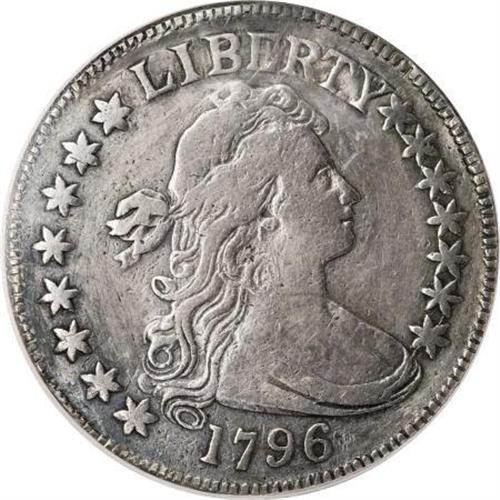 <B>1796 50C 15 Stars--Plugged, Repaired--NCS. Fine Details.</B></I> O-101, R.5. Collectors seeking to complete a type set of U.S. coinage face a significant "stopper" in the low-mintage (3,918 pieces) Draped Bust Small Eagle half dollar, bearing the date 1796 or 1797. Consequently, even "impaired" specimens bring strong prices. An ANACS Fine 15, Tooled, Whizzed 1796 15 stars coin, for example, brought $43,125 in our May 2007 Central States Signature sale, and an NCS Fine Details, Repaired, Whizzed piece of the same issue realized $37,260 in our October 2006 Dallas Signature Auction.<BR> The present NCS Fine Details coin was plugged in the upper right obverse border, and most of the letters in LIBERTY were strengthened, as were portions of the lower right wreath on the reverse. The design features display strong definition, most of which is original, save for the few re-engraved elements alluded to above. Localized smoothing is visible in the obverse fields, apparently to remove pockmarks, some of which are seen in the reverse fields. Both sides reveal steel-gray patina, along with blue accents on the obverse. Despite the impairments, this coin will be an appropriate, and "affordable," addition to a U.S. type collection.<BR><I>From The John Stimson, Sr. Collection, Part Two.</B></I><BR><BR><B>Coin Engraver:</B> Robert Scot<BR><BR><b>Shipping:</b> Coins & Currency (<a target="_blank" href="http://www.heritageauctions.com/common/shipping.php">view shipping information</a>)
