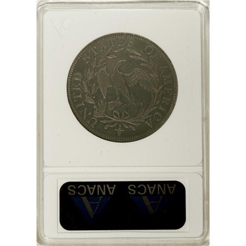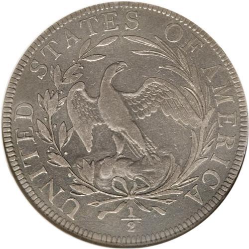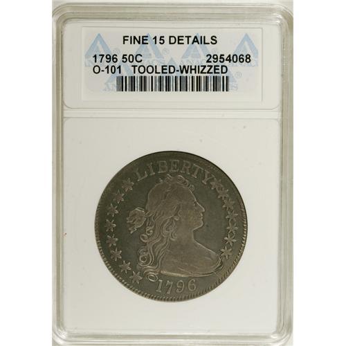 <B>1796 50C 15 Stars--Tooled, Whizzed--ANACS. Fine 15 Details.</B></I> O-101, R.5. The 1796 half dollar comes in two varieties: the first displays 15 stars on the obverse (Overton-101), and the second shows 16 stars (Overton-102). The two 1796 issues, along with 1797-dated half dollars, are part of the famed Draped Bust, Small Eagle design type. Collectors seeking to complete a type set of U.S. coinage place tremendous price pressure on this low-mintage series (3,918 pieces). Consequently, even "impaired" specimens bring strong prices. An NCS Fine Details, Repaired, Whizzed 1796 15 Stars coin, for example, realized $37,260 in our October 2006 Dallas Signature Auction.<BR> The present Fine 15 Details specimen displays light to medium gray surfaces that have been lightly whizzed. The design elements are well centered on the planchet, and exhibit relatively strong definition. The diagnostic crack from the obverse rim at 5 o'clock travels through the drapery and stars 15, 14, and 13 before returning to the rim. Some unobtrusive circulation marks on each side are mentioned for complete accuracy, but we can find no direct evidence of tooling. All in all, this is a fairly nice example of this tough type coin, the ANACS disclaimers notwithstanding.<BR><I>From The Hoosier Discovery Collection.</B></I><BR><BR><b>Shipping:</b> Coins & Currency (<a target="_blank" href="http://www.heritageauctions.com/common/shipping.php">view shipping information</a>)