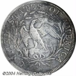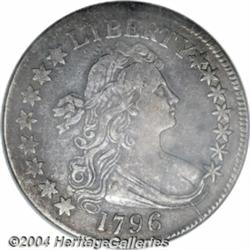 <table><tr><td><table><tr><td>1796 50C 15 Stars XF40 Repaired, PCI. The short-lived Draped Bust, Small Eagle half dollar of 1796-1797 has a reported mintage of 3,918 pieces. The 1796 issue consists of two varieties, one with 15 stars (O-101), and the other with 16 stars (O-102). Type set collectors, as well as date and variety specialists, put enormous pricing pressure on survivors in all grades, as evidenced by the significant increase in prices realized at auction over the past year or two. With the survival rate of this two-year type coin believed to number less than three hundred pieces, it is not surprising that even low-grade examples, including some with major problems, are in strong demand. The coin in this lot, while not without problems, does display overall XF definition, which is more evident on the obverse. It has, however, been repaired at 12 o'clock on the obverse, and the surfaces appear to have been cleaned at one time. The obverse has retoned a medium charcoal-gray with gold undertones, while the reverse exhibits bright steel-gray surfaces. This lot is likely to see spirited bidder competition for what is becoming one of the most elusive and highly-valued of all U.S. type coins. <BR><BR><B>Important notice:</B> Heritage usually auctions material at the rate of 200-250 lots per hour. On some occasions eBay Live bid software or the Internet may not be able to keep up with the pace of the auction. We recommend placing a realistic absentee bid now as insurance to avoid disappointment. Occasionally the auctioneer may eliminate or reject an eBay Live bid, and the auctioneer may also reopen a lot after the close of the eBay live bidding (usually because we missed an audience bid), and may reject your bid even if it shows you as the winning bidder. By bidding via eBay Live, you agree that Heritage may award the lot to another bidder at its sole discretion under the circumstances described above or any other reasonable circumstances. Since eBay bids are not shown to us until we open the lot on the floor, we treat those bids just like floor bids. In most cases the floor responds before the eBay bid is presented to us, due to Internet lag time, so for consistency we have made it a policy that floor bids are always considered first over tie eBay live bids. Also please note that all Heritage lots purchased through eBay Live carry a 20% Buyer's Premium. Please make sure you read the Terms and Conditions before you bid. <BR><BR><B>IMPORTANT ANNOUNCEMENT ABOUT RESERVES:</B> Heritage now divulges all reserves on its web site 7 days before every auction. If you want to know whether the reserve on this lot has been met, and if not, what the reserve amount is, please visit this lot page on the HeritageCoin.com web site, or email: bid@HeritageGalleries.com </span></font></td></tr></table></td></tr></table>