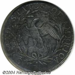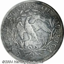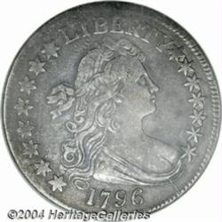 <B>1796<50C> 15 Stars XF40 Repaired, PCI.</B></I> The short-lived Draped Bust, Small Eagle half dollar of 1796-1797 has a reported mintage of 3,918 pieces. The 1796 issue consists of two varieties, one with 15 stars (O-101), and the other with 16 stars (O-102). Type set collectors, as well as date and variety specialists, put enormous pricing pressure on survivors in all grades, as evidenced by the significant increase in prices realized at auction over the past year or two. With the survival rate of this two-year type coin believed to number fewer than three hundred pieces, it is not surprising that even low-grade examples, including some with major problems, are in strong demand. The coin in this lot, while not without problems, does display overall XF definition, which is more evident on the obverse. It has, however, been repaired at 12 o'clock on the obverse, and the surfaces appear to have been cleaned at one time. The obverse has retoned a medium charcoal-gray with gold undertones, while the reverse exhibits bright steel-gray surfaces. This lot is likely to see spirited bidder competition for what is becoming one of the most elusive and highly-valued of all U.S. type coins. <BR><BR><B>Important notice:</B> Heritage usually auctions material at the rate of 200-250 lots per hour. On some occasions eBay Live bid software or the Internet may not be able to keep up with the pace of the auction. We recommend placing a realistic absentee bid now as insurance to avoid disappointment. Occasionally the auctioneer may eliminate or reject an eBay Live bid, and the auctioneer may also reopen a lot after the close of the eBay live bidding (usually because we missed an audience bid), and may reject your bid even if it shows you as the winning bidder. By bidding via eBay Live, you agree that Heritage may award the lot to another bidder at its sole discretion under the circumstances described above or any other reasonable circumstances. Since eBay bids are not shown to us until we open the lot on the floor, we treat those bids just like floor bids. In most cases the floor responds before the eBay bid is presented to us, due to Internet lag time, so for consistency we have made it a policy that floor bids are always considered first over tie eBay live bids. Also please note that all Heritage lots purchased through eBay Live carry a 20% Buyer's Premium. Please make sure you read the Terms and Conditions before you bid. </span></font></tr></table></td></tr></table>