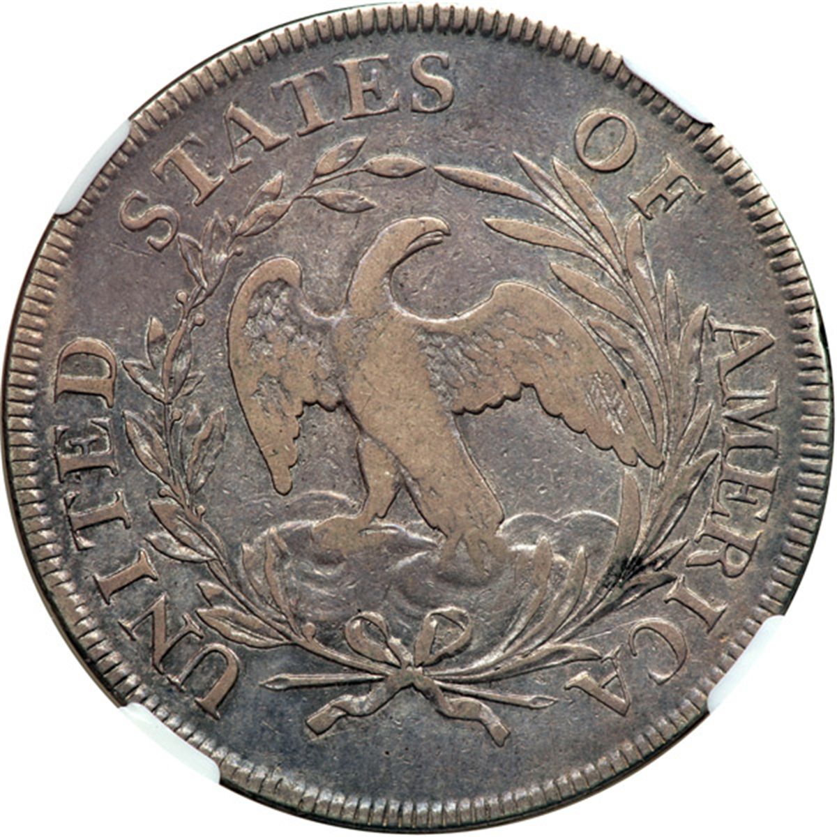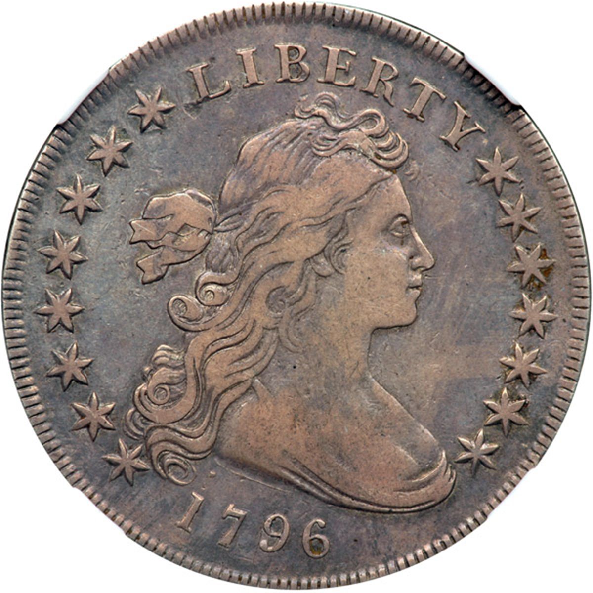 1796 Draped Bust Dollar. Small date, large letters. NGC graded VF-35. Problem-free with attractive greyish-violet toning. Has a small rim bruise above A(M) on the reverse, scarcely worth noting. Smooth surfaces throughout; stronger detail on the obverse than reverse as is often seen. A scarce Type which includes a draped bust profile of Liberty paired to the Small Eagle reverse which the mint used only in 1795-98. Desirable Red Book "Type".