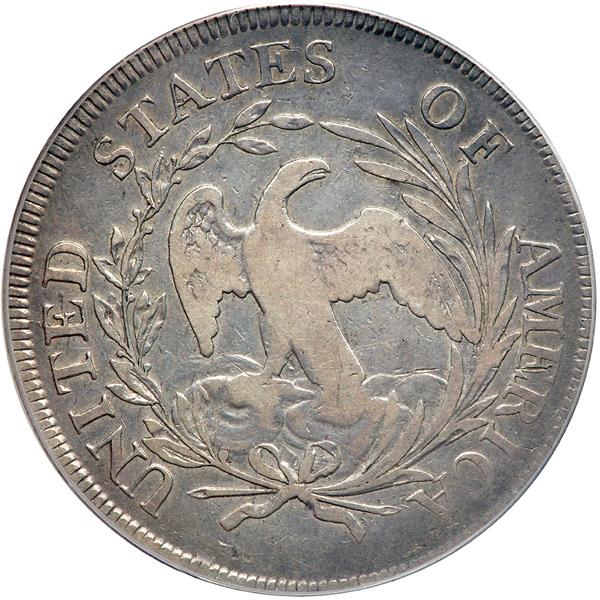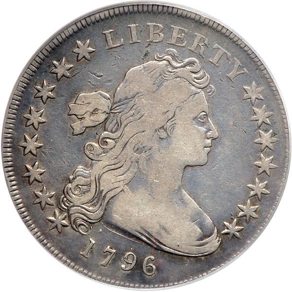 1796 Draped Bust Dollar. Small date, large letters. PCGS graded Fine-15. Small Date, Large Letters Natural light to medium gray, relatively mark-free surfaces display old-silver color, with the overall appearance greatly bolstered by the strong devices. Regarding this date, the estimated mintage of 75,000 1796-dated dollars (of various die varieties combined, each of the draped bust type) is less than that of the estimated mintage of 110,000 Draped Bust dollars coined with the date 1795. Bowers, in his silver dollar encyclopedia, advances the opinion "that many if not most 1796-dated pieces were struck later, in 1798. Much of the calendar year mintage of 75,212 dollars struck in 1796 were probably dated 1795. I believe that mintage during the first part of calendar year 1798 consisted in large part of dollars dated 1795, 1796, and 1797."