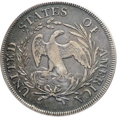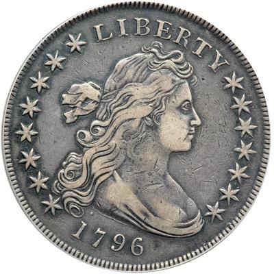 1796 Draped Bust Dollar. Small date, large letters. . BB-61, B-4. PCGS graded VF-30. Well struck on a nice clean planchet with medium grey toning and lighter highlights. The Mint experienced various difficulties in 1796, including a yellow fever epidemic. Coinage was anything but easy. On June 1, 1796, Tennessee was admitted to the Union as the 16th state. While other denominations reflected this, 16 stars were not used on silver dollars until 1797, which suggests that obverse dies for 1796-dated dollars were made prior to June. The number of dies employed to create 1796-dated dollars is as follows: 1796 obverses, 4; 1796 reverses, 4 (includes one left over from 1795).