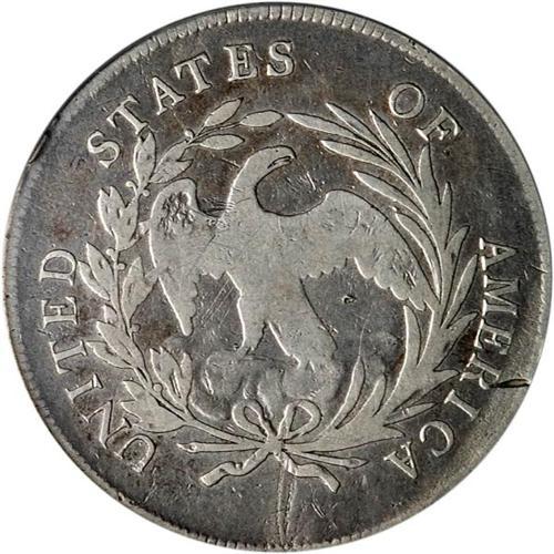 <b>1796 Draped Bust Dollar. Small date, small letters. PCGS graded BB-61. Very Good 08.</b> A small mark above R of AMERICA with some granularity in the surface either side of this. Smooth medium gray surfaces contrasted by light "rubbed silver" highlights (all original and choice). A well struck, balanced coin for the Type set collector <b>(PCGS # 6859)</b> <i>
