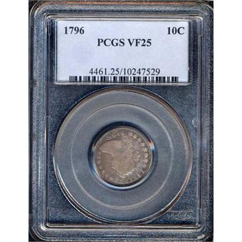 <b>1796 Draped Bust Dime. PCGS graded VF25.</b> First year of issue and the very presentable draped bust, small eagle Type struck only this year and in 1797. Here is a smooth-featured, lightly toned, and elegant looking coin for someone's Type set <b>(PCGS # 4461)</b> <i>