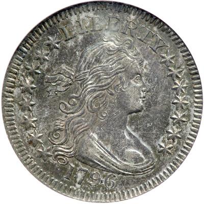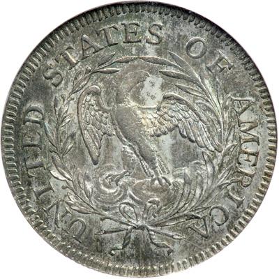 Robert Scot designed the Draped Bust facing right motif. Included are eight stars behind, seven in front of Liberty, for a total of 15 (the only star count seen on the quarter dollar this year, unlike several other denominations of this design where 15 or 16 stars are found). LIBERTY is above, the date 1796 is below. On the reverse a Small Eagle (so called), is within by a wreath of laurel and of palm, the two halves tied with a bow at the bottom. The dentils are long, finger-like and prominent on both sides, a feature that always leaves a nice impression on the viewer. There is no mark of value unlike halves and silver dollars which have it on the edge of the coin. The edge is reeded instead, to discourage coin-shavers. Always in great demand. Pop 4; 22 better.